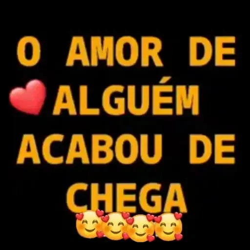 Um coração vermelho e texto em amarelo que diz 'O AMOR DE ALGUÉM ACABOU DE CHEGA' com emojis de coração e sorrisos.