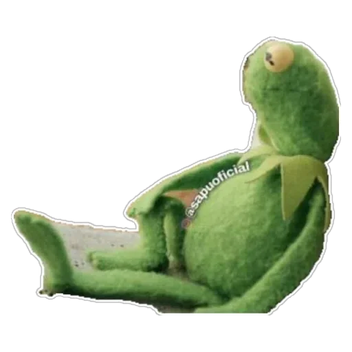 Um sapo de pelúcia verde, parecido com o Kermit, sentado com expressão relaxada e um colar verde, com o texto '@sapuooficial' sobreposto.