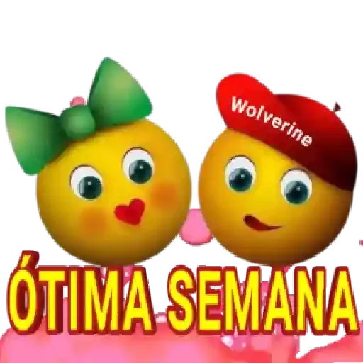 Dois emojis de rostos amarelos, um com um laço verde no cabelo e o outro com um chapéu vermelho com 'Wolverine', com a frase 'ÓTIMA SEMANA' em letras amarelas.