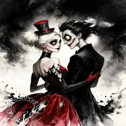 Um casal de personagens sombrios e gothic, com maquiagem pesada e roupas escuras, dançando ou se abraçando em um fundo cinza e preto.