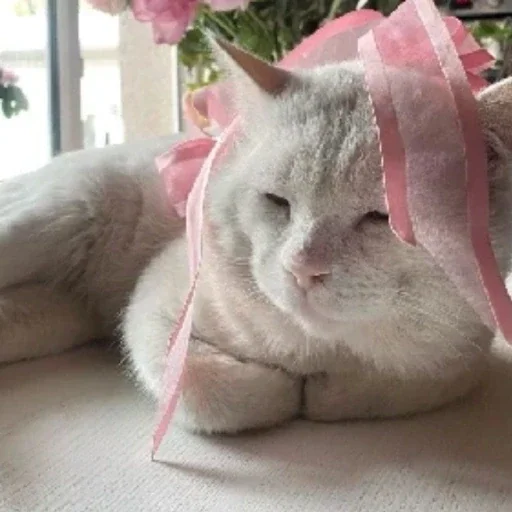 Gato branco deitado com uma fita rosa na cabeça, parecendo descontente ou entediado.