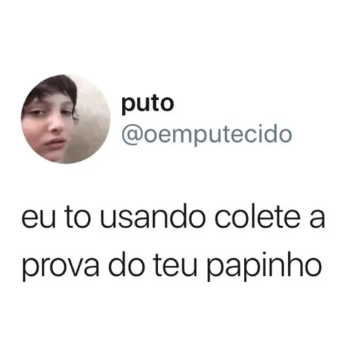 Um screenshot de uma postagem de rede social com um jovem com expressão facial séria e o texto 'eu to usando colete a prova do teu papinho'.