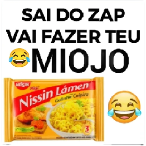 Pacote de macarrão instantâneo Nissin Lâmen com texto 'SAI DO ZAP VAI FAZER TEU MIOJO' e dois emojis de rosto rindo com lágrimas.