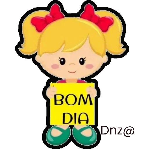 Menina de cabelos loiros com dois coque baixos e laços vermelhos, sorrindo e segurando um cartaz amarelo com 'BOM DIA' em letras pretas.