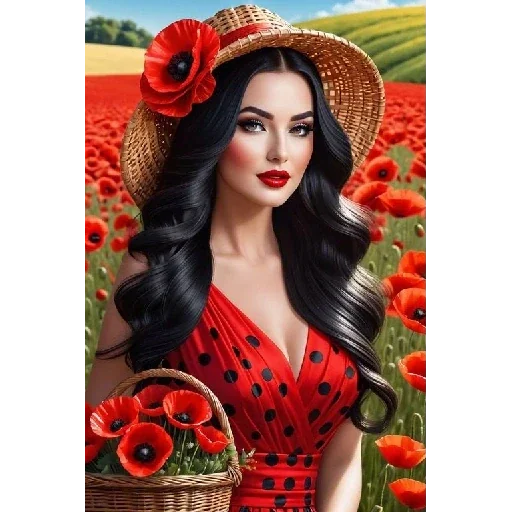Mulher com chapéu de palha e flor vermelha, vestido vermelho com manchas pretas, segurando uma cesta de flores vermelhas em um campo de papoulas.