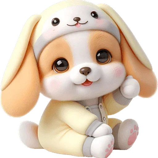 Um cachorro fofinho vestido com um macacão amarelo e uma touca de coelho, com olhos grandes e expressivos.