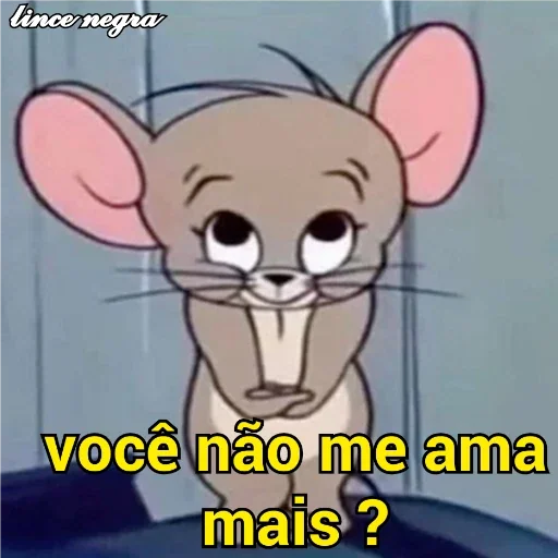 Um rato de desenho animado com orelhas grandes e expressão triste, com o texto 'você não me ama mais?' em amarelo na parte inferior.