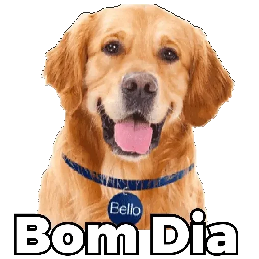 Um cachorro dourado com uma coleira azul e uma plaquinha que diz 'Bello' sorri com a língua para fora. Abaixo dele está escrito 'Bom Dia'.