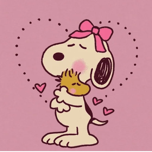Snoopy e Woodstock se abraçando com corações ao redor, Snoopy com um laço rosa na cabeça.