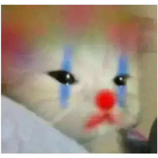 Um gato branco com lágrimas azuis e um nariz vermelho, parecendo chorar.