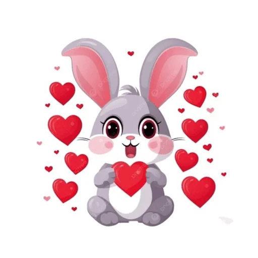 Um coelho cinza com orelhas grandes e coração vermelho no peito, rodeado de corações vermelhos e rosas.