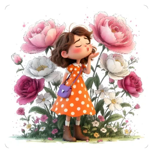 Menina com vestido laranja de flores brancas, cheirando uma flor rosa, cercada por flores coloridas.