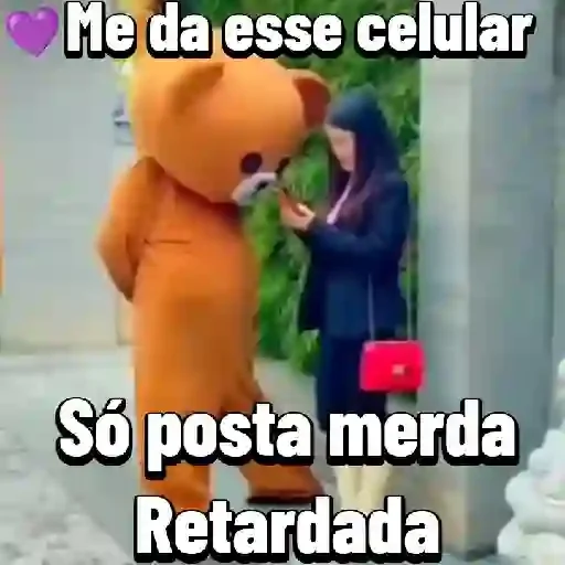 Um urso de pelúcia laranja e uma mulher de hijab trocando um celular, com texto "Me da esse celular Só posta merda Retardada".