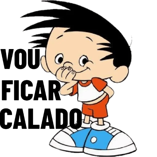 Menino de anime com cabelo preto e roupa laranja e branca, com a mão na boca e expressão pensativa. Ele está em pé em cima de um tênis, com a frase 'VOU FICAR CALADO' ao lado.