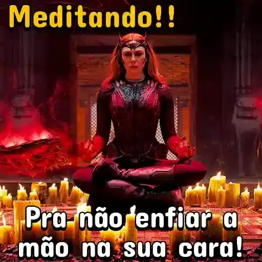 Uma mulher meditando com velas ao redor, vestida de preto, com a frase 'Meditando!!' em amarelo e 'Pra não enfiar a mão na sua cara!' em branco.