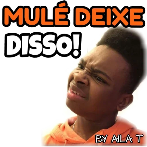 Um jovem negro com expressão de desaprovação ou surpresa, vestindo uma camisa laranja. O texto "MULÉ DEIXE DISSO!" aparece em letras grandes e coloridas acima dele.