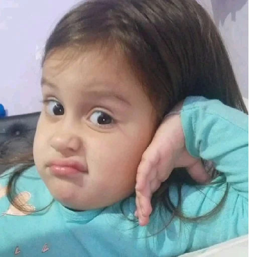 Menina com expressão curiosa, mão no rosto, olhando para o lado com uma blusa azul.