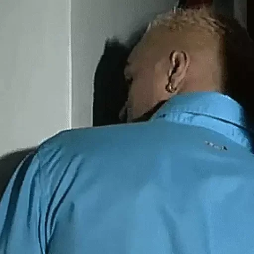 Homem de costas, com cabelo raspado e camisa azul, olhando para o lado.