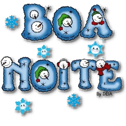 Boneco de neve com óculos e chapéu de dormir, em letras azuis que formam 'BOA NOITE', com flocos de neve ao redor.