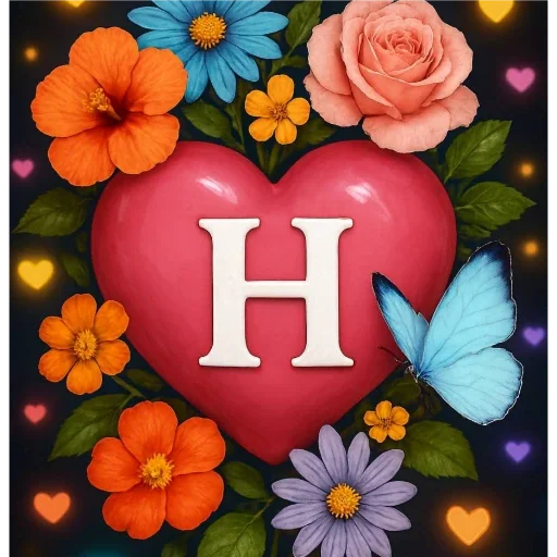 Um coração vermelho grande com a letra 'H' em branco no centro, rodeado de flores coloridas, borboletas e corações pequenos em um fundo preto.