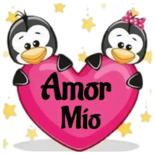 Dois pinguins fofos com um coração rosa que tem escrito 'Amor Mío'. O pinguim da direita tem um laço rosa na cabeça.