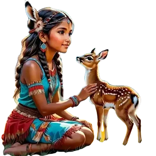 Uma jovem índia com tranças e adornos coloridos acaricia um cervo jovem com manchas marrons e brancas.