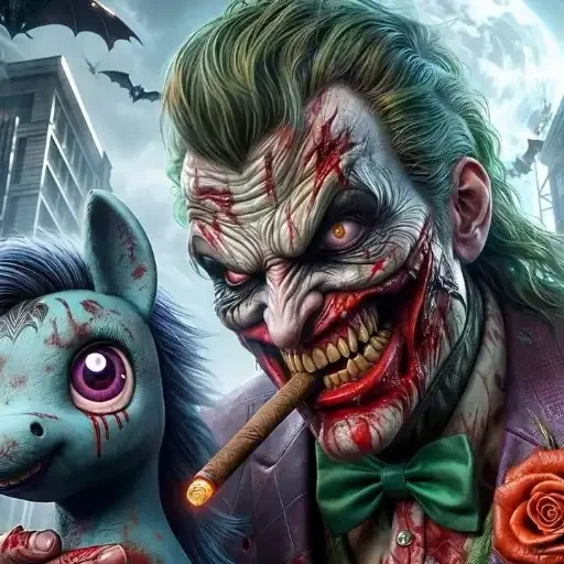 O Coringa com uma aparência sinistra e suja de sangue ao lado de um unicórnio azul com sangue e um olho roxo gigante, com uma cidade ao fundo e morcegos voando.