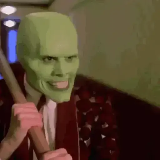 Um homem com máscara verde e um taco de beisebol, parecendo ameaçador, com um fundo escuro.