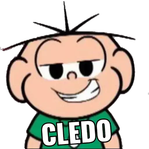 Personagem de desenho animado com expressão cômica, cabelo preto espetado, olhos pretos e sorriso largo. Ele usa uma camisa verde com o texto 'CLEDO' em letras brancas.