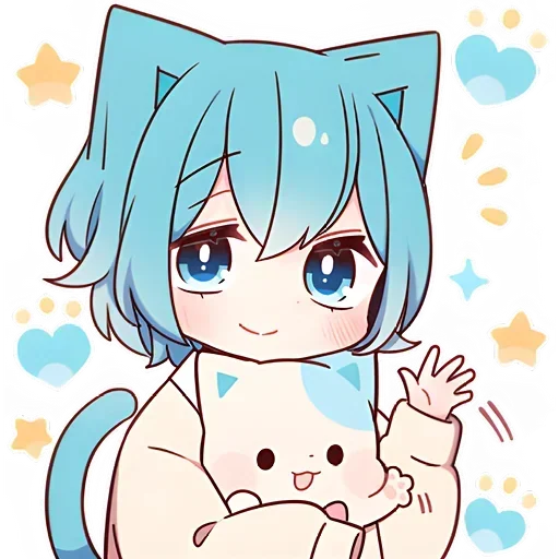 Uma menina de cabelo azul com orelhas de gato e um rabo, abraçando um animal fofo. Ela está cercada por estrelas e corações amarelos e azuis.