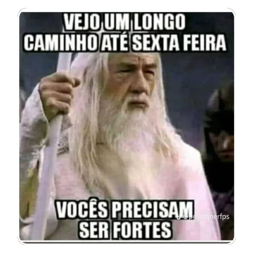 Imagem de um homem idoso com barba e cabelo longo, vestido de branco, com texto em português: 'VEJO UM LONGO CAMINHO ATÉ SEXTA FEIRA' e 'VOCÊS PRECISAM SER FORTES'.
