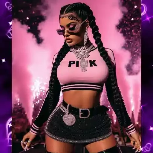 Uma mulher com tranças longas e maquiagem colorida, vestindo uma blusa rosa com a palavra 'PINK' e um shortinho preto, com um cinto com uma fivela em forma de coração.