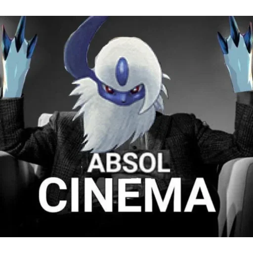 Um personagem de anime com aparência de monstro, com pelos brancos e olhos vermelhos, usando um casaco preto. Ele tem uma marca roxa na testa e garras azuis. Ao fundo, o texto 'ABSOL CINEMA' em letras brancas.