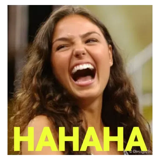 Uma mulher com cabelo castanho e um sorriso largo, rindo com a boca aberta. A palavra 'HAHAHA' está escrita em amarelo na parte inferior.