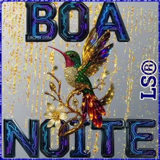 Um beija-flor colorido com penas verdes, vermelhas e douradas está em uma flor branca, com as palavras 'BOA NOITE' em letras grandes e brilhantes ao fundo.