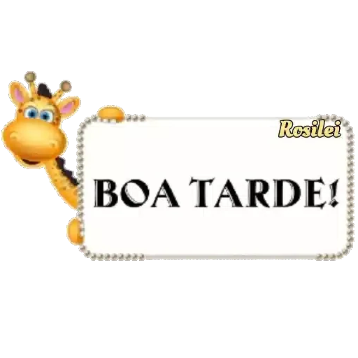 Um girafa amarelo com expressão feliz ao lado de um retângulo com a mensagem 'BOA TARDE!' em letras pretas.