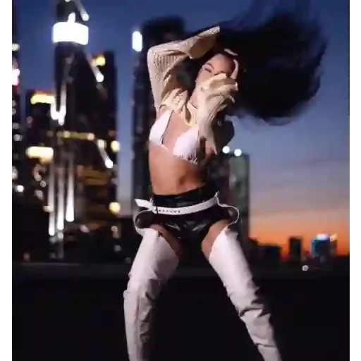 Mulher dançando em frente a uma cidade à noite, usando lingerie branca e meias-calças brancas. Ela tem o cabelo preto e longo ao vento.