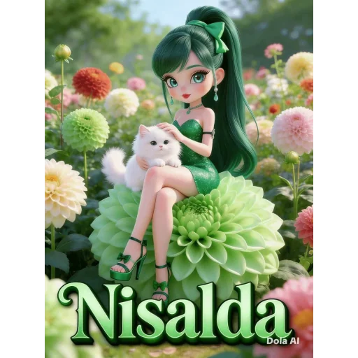 Uma menina de cabelo verde longo sentada em uma flor grande com um gato branco ao lado, em um jardim colorido. Ela está vestida com um vestido verde e sapatos de salto.