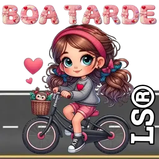 Menina de olhos azuis e cabelos castanhos, com faixa rosa na cabeça, anda de bicicleta pela estrada com cesta de flores e corações ao redor. A imagem traz 'BOA TARDE' em letras rosadas.