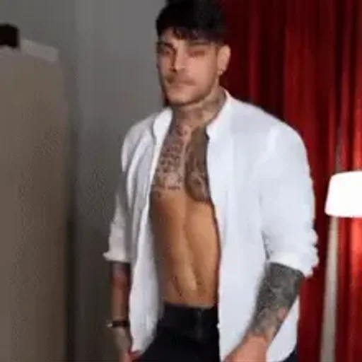 Um homem musculoso com tatuagens, camisa branca aberta e calças pretas em frente a uma cortina vermelha.