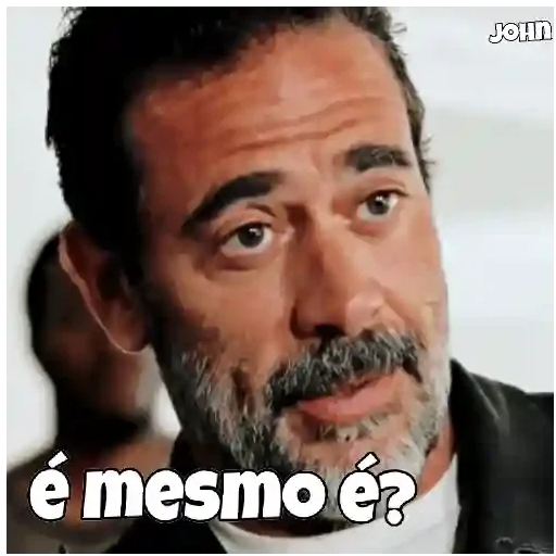 Um homem com expressão cética, sobrancelhas franzidas e bigode grisalho. A legenda 'é mesmo é?' aparece embaixo.