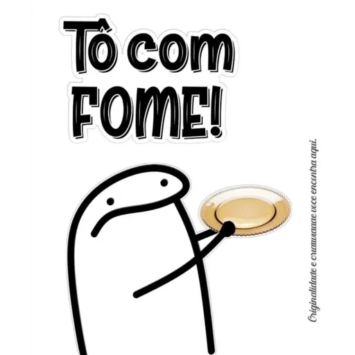 Um desenho simples de uma pessoa com fome, mostrando um prato de comida com um sorriso. A pessoa tem uma expressão de fome e o texto 'Tô com FOME!' está escrito acima.