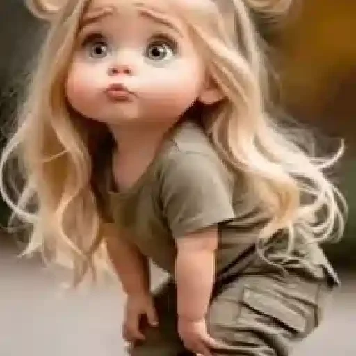 Menina loira com expressão surpresa ou confusa, vestindo uma camiseta e calça verde. Olhos arregalados e sobrancelhas franzidas.