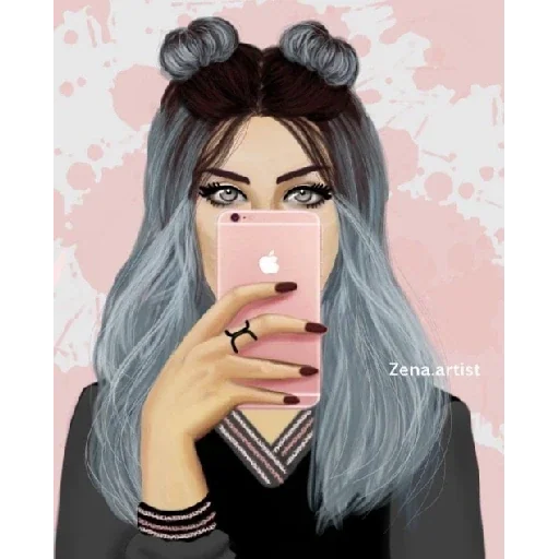 Uma mulher jovem com cabelos cinza-azulados e dois coques na cabeça segura um iPhone rosa na frente do rosto, com unhas pintadas de escuro e um anel no dedo. Ela está vestindo um suéter cinza.