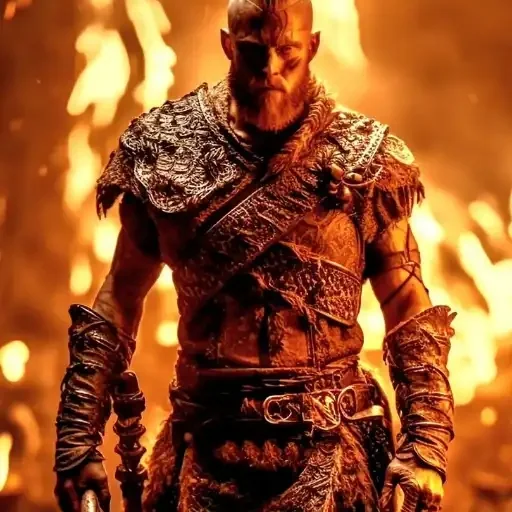 Um homem musculoso com uma barba e careca, vestindo uma armadura, em pé em frente a chamas altas e intensas.
