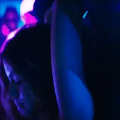 Uma mulher com expressão surpresa ou chocada, iluminada por luzes coloridas em um ambiente noturno.