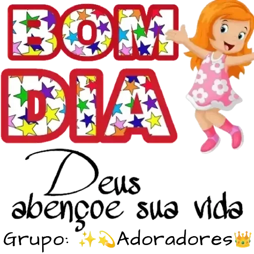 Uma menina de cabelo laranja e vestido rosa com estrelas brancas dançando ao lado das palavras 'BOM DIA' em letras grandes e vermelhas cheias de estrelas coloridas, com o texto 'Deus abençoe sua vida Grupo: Adoradores' abaixo.
