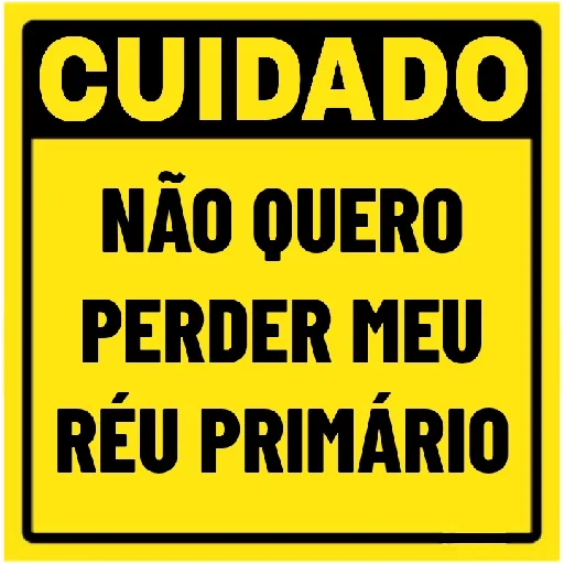 Placa de advertência amarela com texto preto e borda preta. Escreve 'CUIDADO' em letras grandes na parte superior e 'NÃO QUERO PERDER MEU RÉU PRIMÁRIO' no centro.