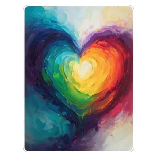 Uma ilustração colorida de um coração com ondas de cores, bolas e flores. Uma menina está ao lado esquerdo com um buquê…