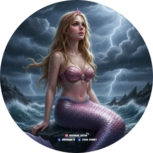 Sereia ruiva com cauda roxa sentada em uma rocha em meio ao mar agitado com tempestade ao fundo.